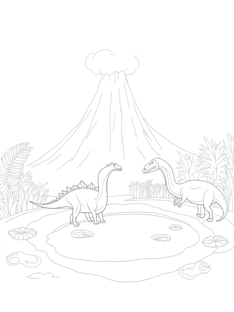 Look closely! You’ll see large, ancient footprints scattered around the scene, hinting at the dinosaurs that roamed this vibrant landscape. These prints lead off toward the horizon, sparking the imagination about where they might go next. Perfect for kids who love dinosaurs and nature, this coloring page invites little artists to fill the world with their favorite colors.