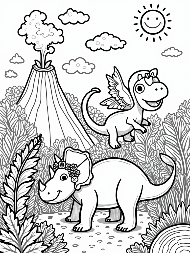 You’ll find a cheerful triceratops wearing a flower crown, happily munching on some greenery next to a giant fern. Nearby, a pterodactyl is soaring through the sky, and its wings are making a lovely heart shape! Over to the side, a stegosaurus with a rainbow of plates is peeking out from behind some vibrant rocks. And let’s not forget the volcano in the background, puffing out gentle clouds of smoke while the sun shines brightly above, surrounded by fluffy clouds that look like they’re smiling.