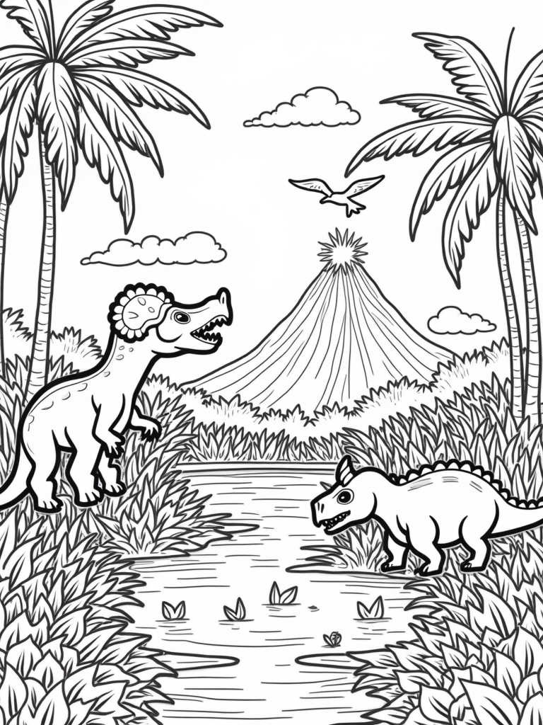 Friendly Dinosaurs in a Prehistoric Jungle Coloring Page