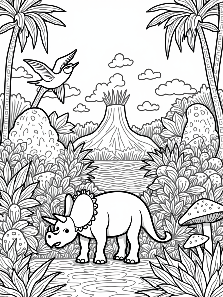 Friendly Triceratops in a Lush Prehistoric Jungle Coloring Page