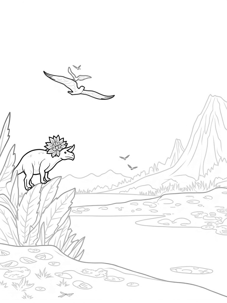 Picture a vibrant prehistoric jungle filled with towering ferns and ancient volcanoes! In the foreground, there’s a cheerful triceratops balancing on a giant leaf, looking ready for some fun. Its horns are decorated with colorful flowers, adding a playful touch. Up in the sky, a couple of graceful pterosaurs are gliding around, their wings creating cool shadows on the ground below.
