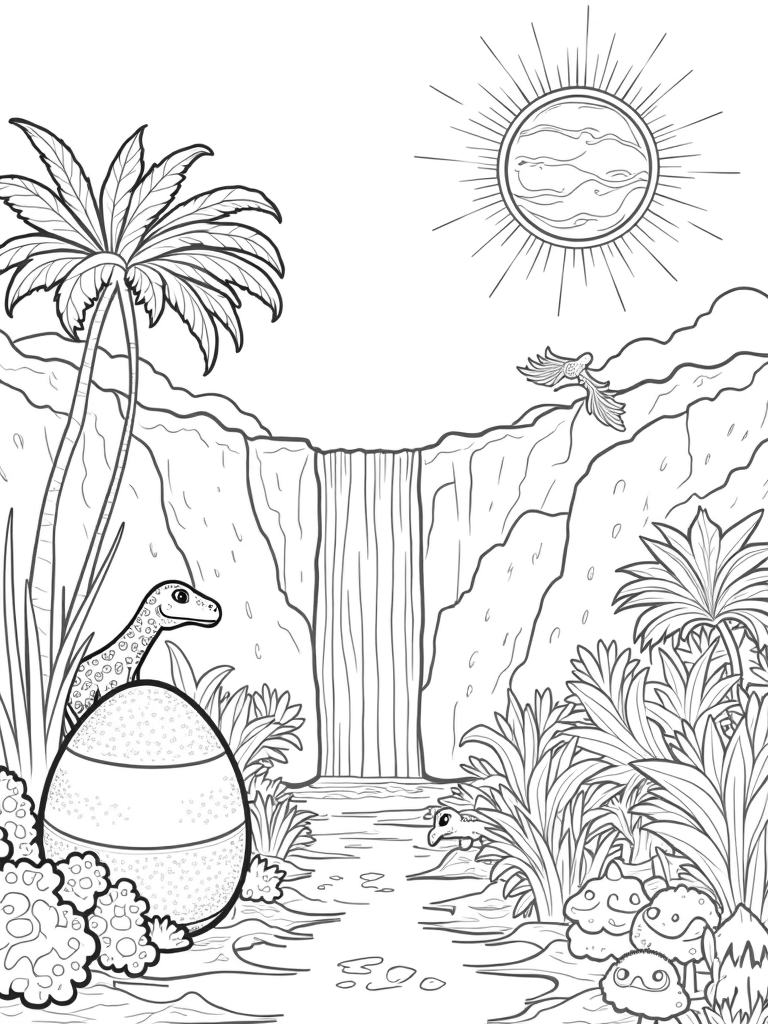 Prehistoric Jungle with Baby Dinosaurs and Giant Egg Coloring Page
