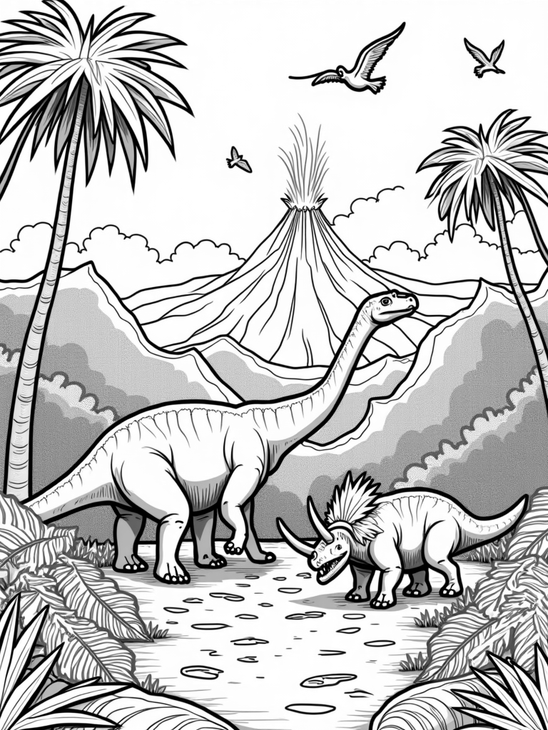 Prehistoric Jungle with Brontosaurus and Triceratops Coloring Page