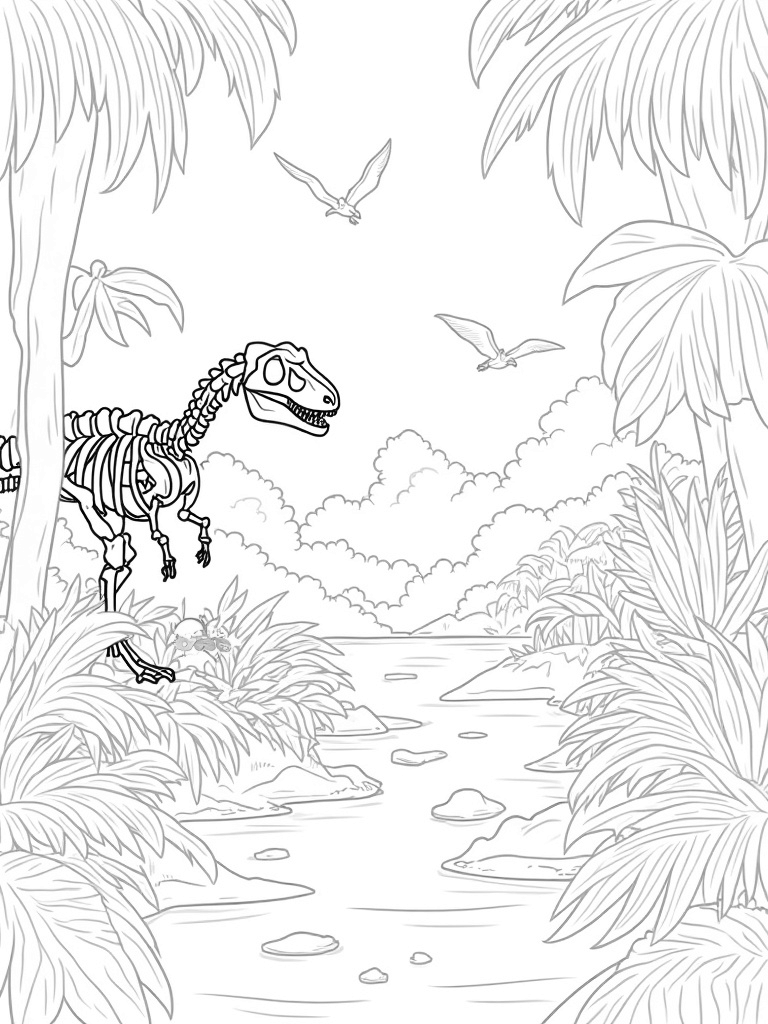 Prehistoric Jungle with Dinosaur Skeleton and Colorful Eggs Coloring Page