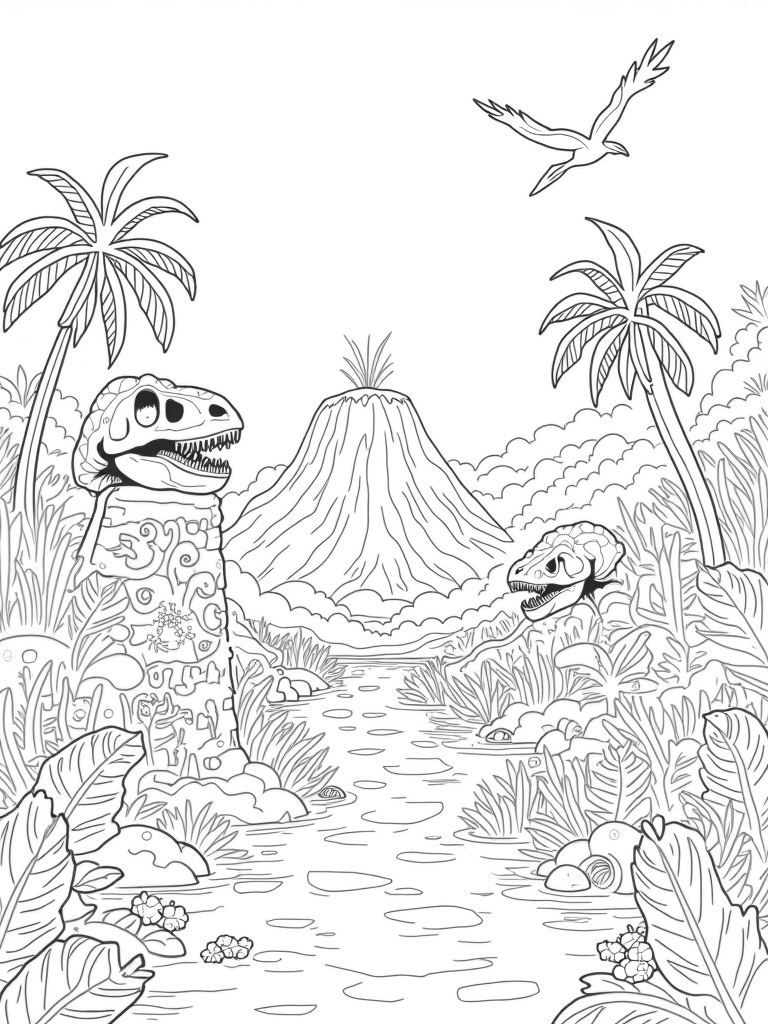 Prehistoric Jungle with Dinosaur Skull and Volcano Coloring Page