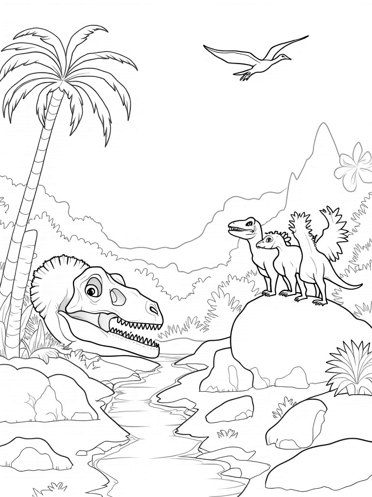 Look up, and you’ll see pterosaurs soaring through the sky, their wings stretched wide as they glide gracefully above distant volcanoes. Below them, a sparkling stream weaves through the scene, creating a tranquil atmosphere. Smooth stones and ancient palm fronds dot the banks, making this a perfect spot for a little coloring fun.