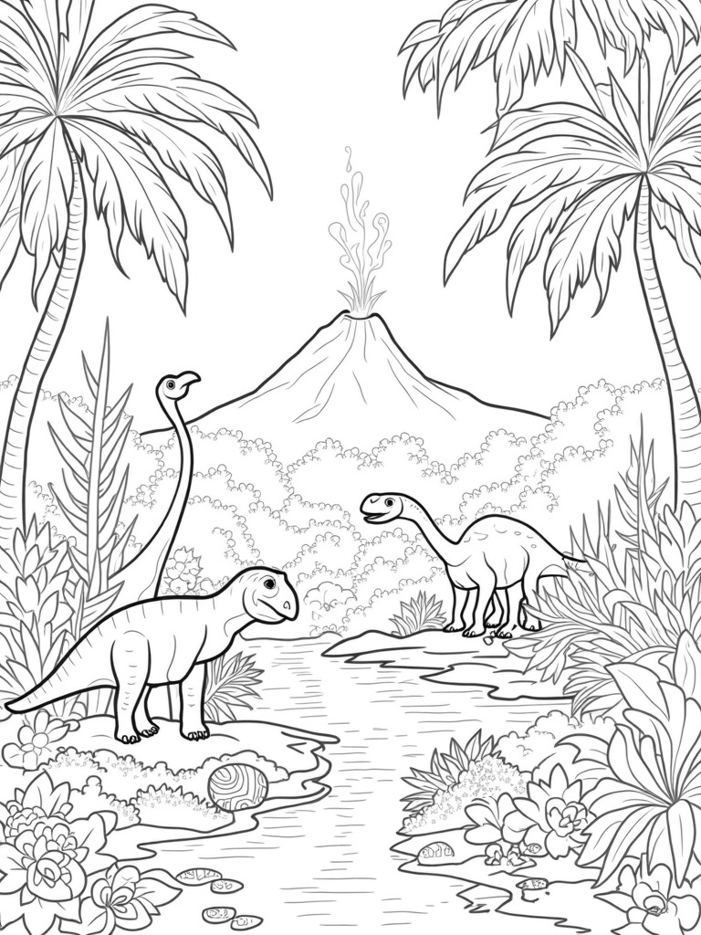 Prehistoric Jungle with Dinosaurs and a Volcano Coloring Page
