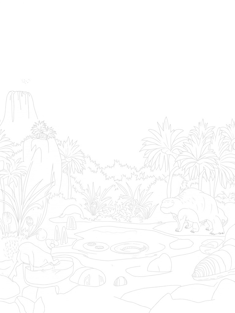 Look at this amazing prehistoric jungle! Towering ferns and giant cycads surround a huge dinosaur footprint that’s filled with water, making a perfect little pond. You can spot lily pads floating around, adding a splash of green. Over to one side, there’s a spiral rock formation decorated with colorful shells that look like they were picked right off a beach!