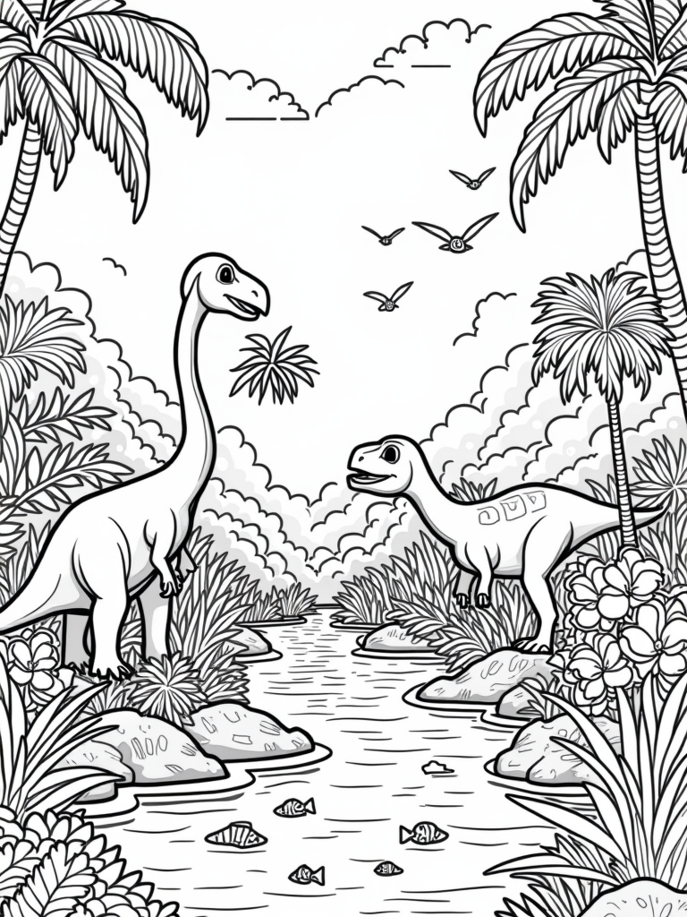 Prehistoric Jungle with Friendly Dinosaurs Coloring Page