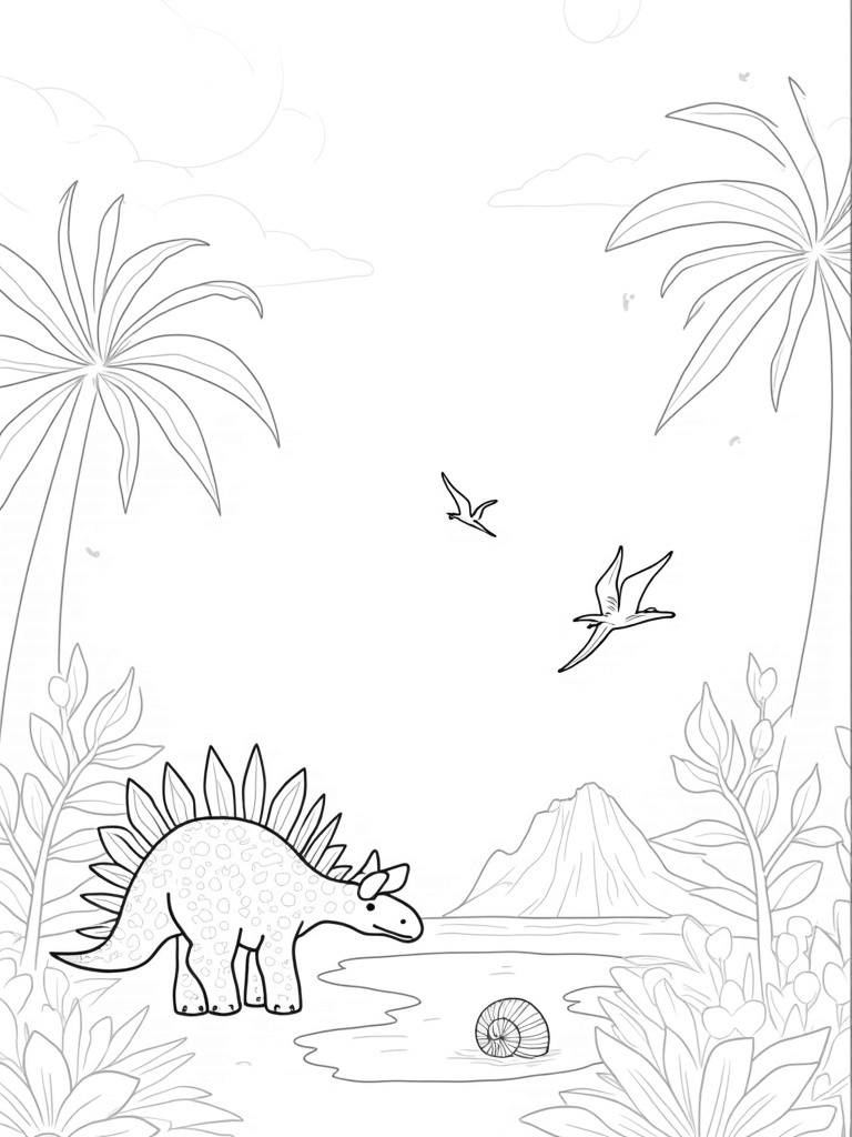 Prehistoric Jungle with Stegosaurus and Pterosaurs Coloring Page
