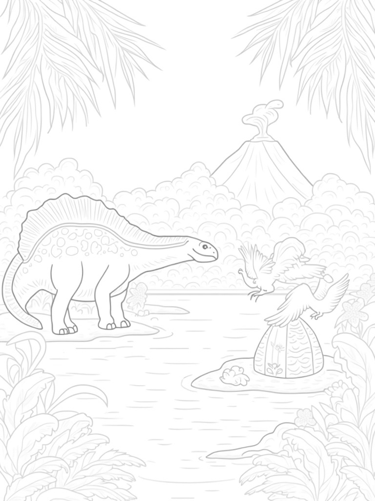 If you look closely, you’ll spot a fossilized dinosaur egg peeking out from the earth, surrounded by delicate wildflowers that add a pop of color to the scene. And in the background, a volcanic mountain looms, with smoke swirling up into the sky, giving the whole jungle an adventurous vibe. It’s a fantastic place for kids to let their imagination run wild while coloring in this lively setting!