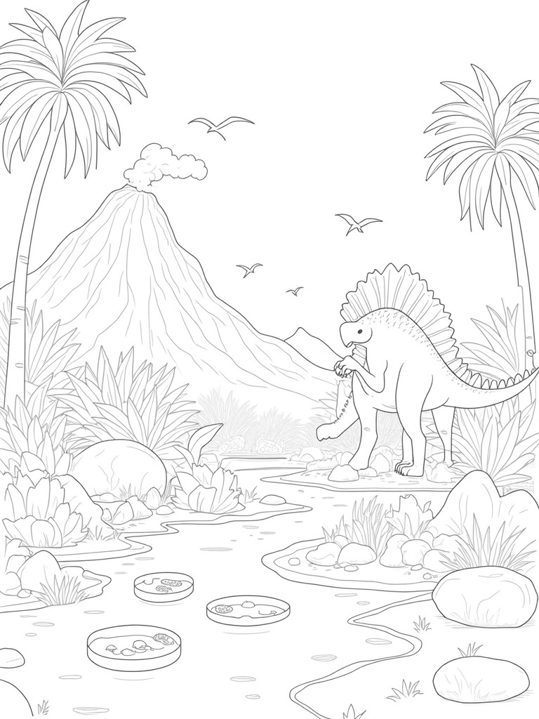 In the background, a volcanic mountain adds some excitement with its colorful, swirling lava erupting from the peak. It’s almost like nature’s fireworks show! Up in the sky, small pterosaurs are gliding through the air, making the whole scene feel alive. Each element brings a unique touch to this prehistoric paradise.