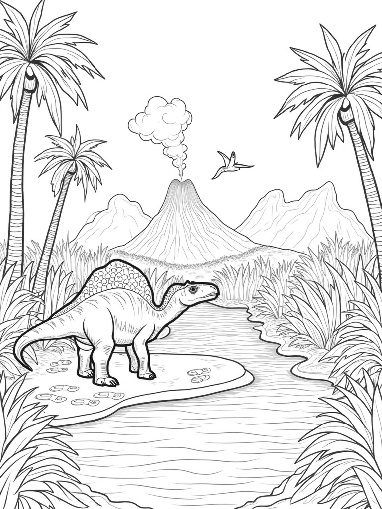 Picture a vibrant prehistoric jungle filled with gigantic ferns and towering palm trees. Right in the middle, a majestic stegosaurus stands tall, its back plates covered in intricate patterns that are just waiting for your creative touch. Nearby, a bubbling volcano adds some excitement to the scene, puffing out little clouds of smoke into the blue sky.