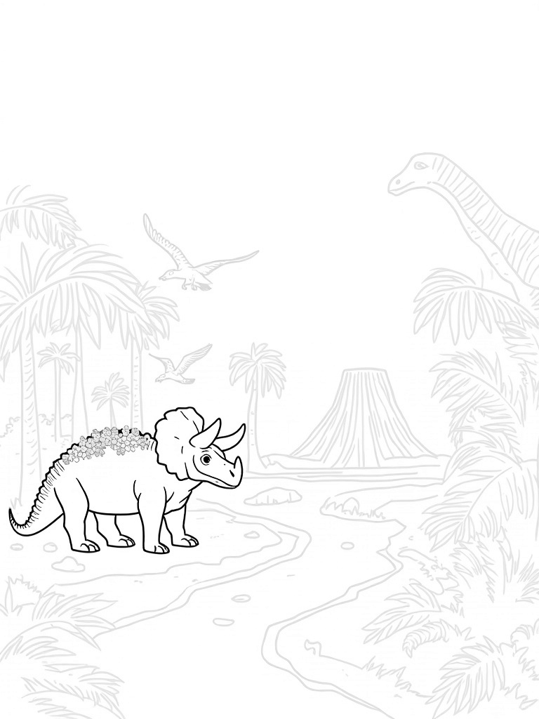 In this vibrant prehistoric jungle, a massive triceratops stands proudly next to a bubbling volcano, its impressive horns decorated with colorful flowers. The lush greenery is filled with towering ferns and ancient cycads, creating a perfect backdrop for these magnificent creatures. Nearby, a winding river flows gently, with smooth stones dotting its banks and playful pterosaurs soaring above, adding a touch of whimsy to this lively scene.