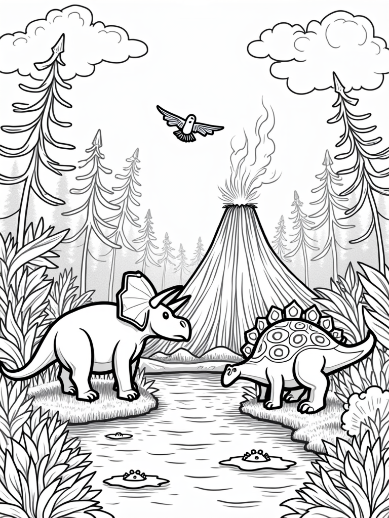 This vibrant coloring page brings to life a prehistoric jungle filled with giant ferns and tall conifer trees. Right in the foreground, you'll see a friendly triceratops munching on some greenery next to a bubbling volcano that sends colorful smoke rings floating into the air. It’s a fun scene that really pops!