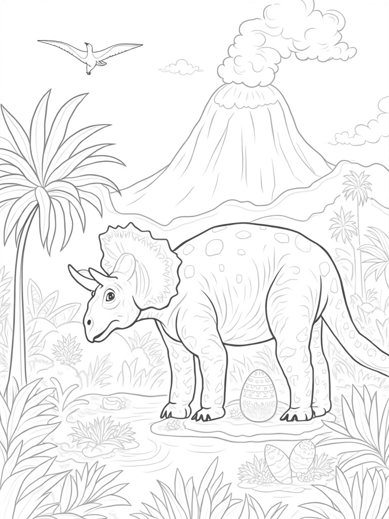Check out this free, printable coloring page featuring a triceratops in a prehistoric jungle! Perfect for dinosaur lovers, this fun scene includes cool eggs and flying pterosaurs. Grab your crayons and get ready to color this awesome adventure!