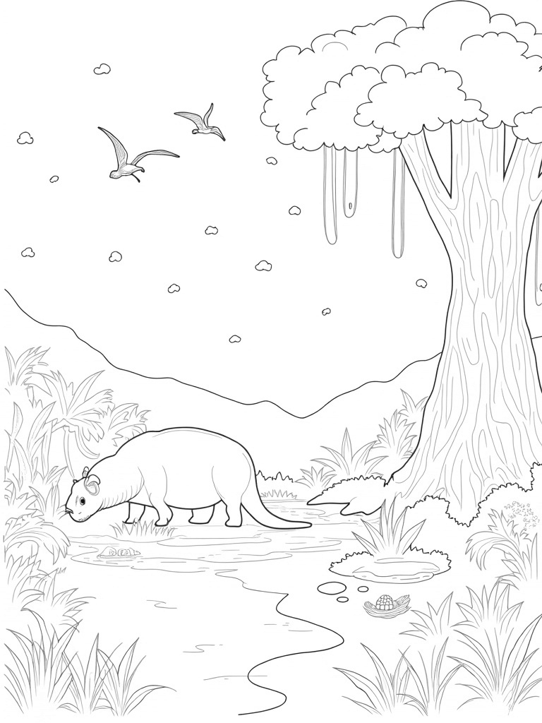 As you color, take a look at the fossilized dinosaur footprints scattered around. They form a winding path, leading to an enormous ancient tree with stunning bark patterns and hanging vines. At the base of this tree, a cozy nest cradles small, colorful eggs, bringing a whimsical touch to this prehistoric setting. It’s a perfect scene for young artists to let their creativity run wild!