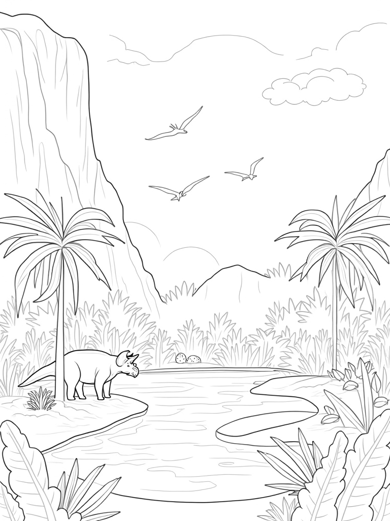 Check out this free, printable coloring page featuring a triceratops in a lush prehistoric jungle! Perfect for kids who love dinosaurs and want to add some colorful fun to their day.