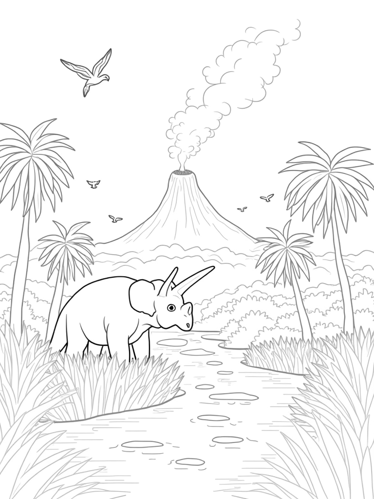 In the distance, a volcano is quietly smoldering, with wisps of smoke curling up into the air. It adds a touch of mystery to this serene landscape. You might even spot some enormous dinosaur footprints leading off into the thick jungle, hinting at the prehistoric creatures that once roamed this land. It’s a great reminder of how fascinating and diverse the world was millions of years ago!