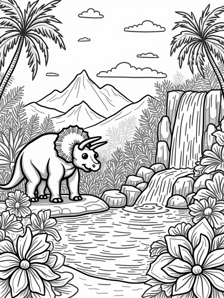 Nearby, a stunning waterfall tumbles over smooth stones, forming a sparkling pond. You can even spot colorful pterodactyls swooping down to take a drink. And don’t miss those oversized, vibrant flowers blooming at the triceratops's feet, adding a splash of color to this already exciting scene. The fluffy clouds above drift lazily around a distant mountain peak, making it feel like a true prehistoric paradise.