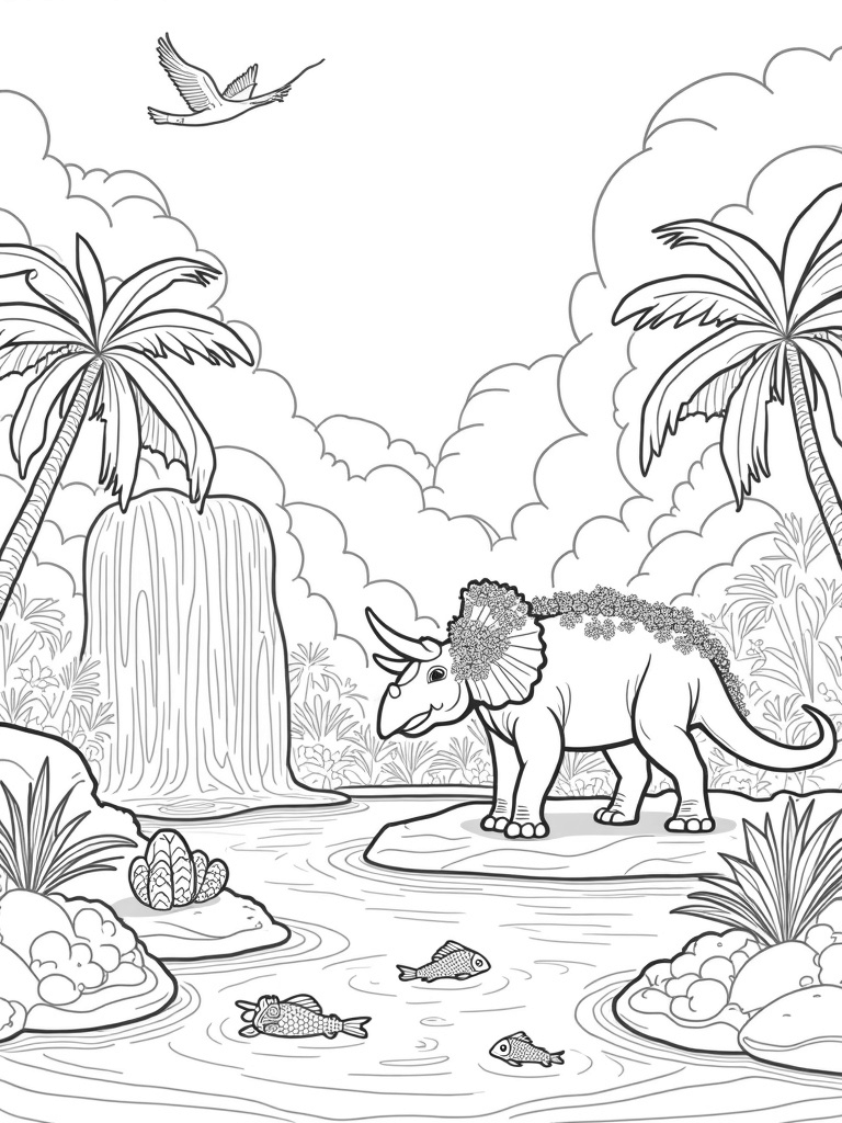 In this vibrant prehistoric jungle, you’ll find a massive triceratops standing proudly in the center. Its horned head is decorated with beautiful blooming flowers, adding a splash of color to the scene. Tall ferns and colossal trees create a lush backdrop, making it feel like a real dinosaur paradise. Just nearby, a waterfall tumbles down into a crystal-clear pool where you might spot colorful fish leaping joyfully above the surface.