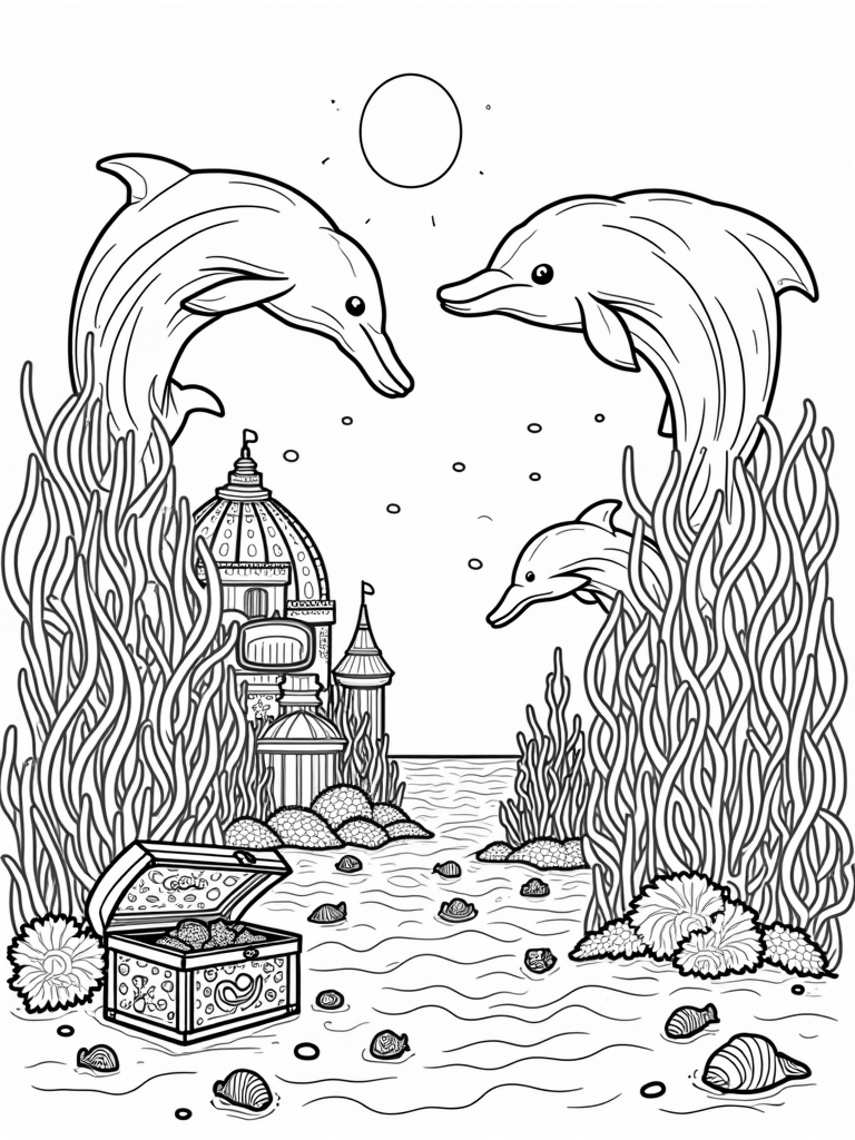 The vibrant coral structures are begging for a splash of color! Think about using bright pinks, blues, and oranges for the dolphins, and maybe some glittery shades for the treasure chest. Don’t forget the sandy ocean floor dotted with starfish and seashells—there’s plenty of room to get creative with your colors!