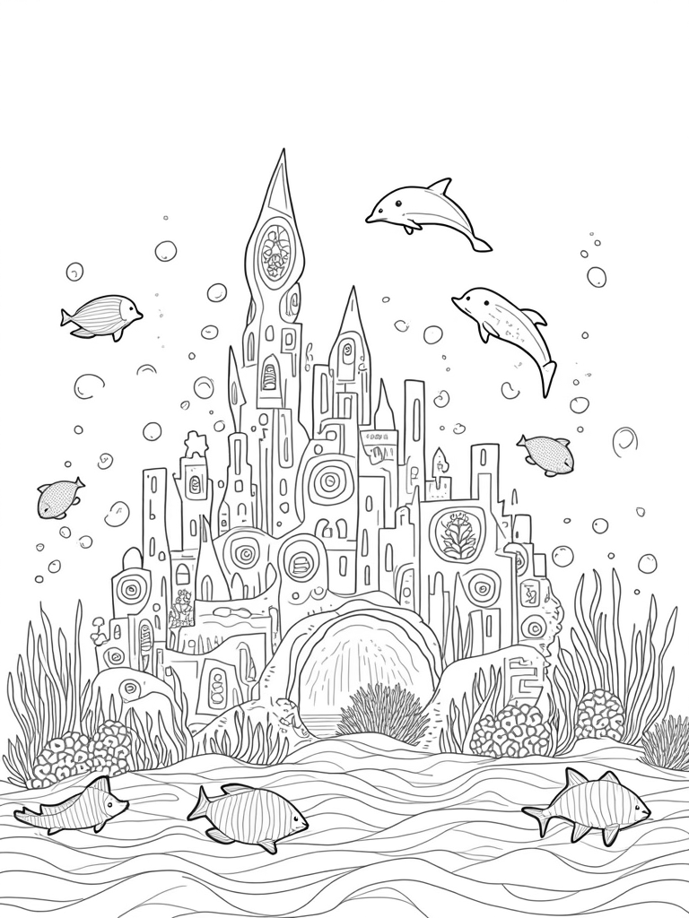 Check out this free, printable coloring page featuring an underwater city with dolphin-shaped spires and vibrant seaweed gardens. Perfect for kids who love dolphins, it's a fun way to get creative with colors!