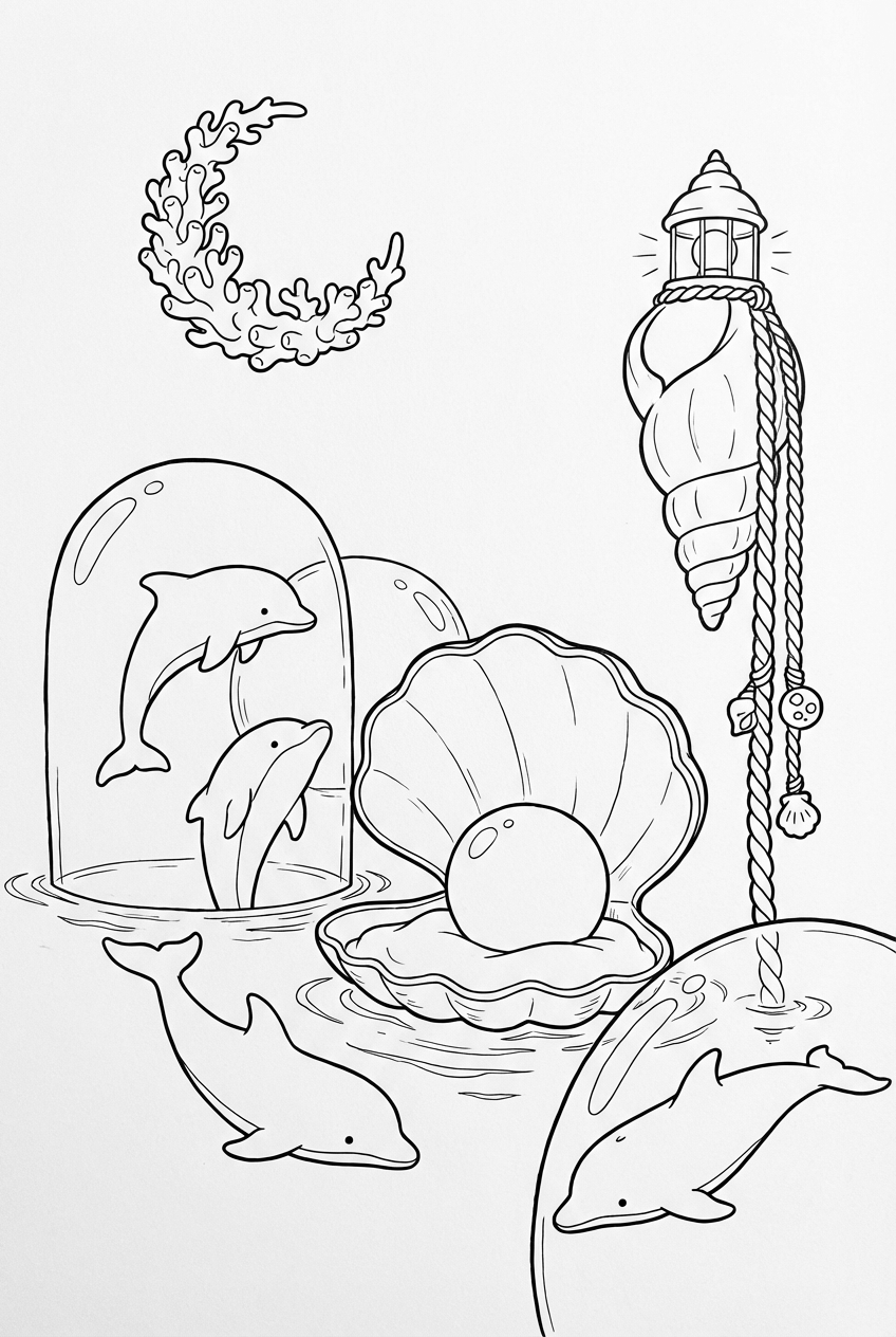 Look closely and you’ll see sleek dolphins slipping through tall glass bubbles that float like big soap bubbles over the water. A giant pearl shell pops up from the lagoon, and a spiraling kelp rope hangs from a tiny seashell lighthouse that glows softly. Up above, a crescent moon made entirely of coral watches the whole scene.