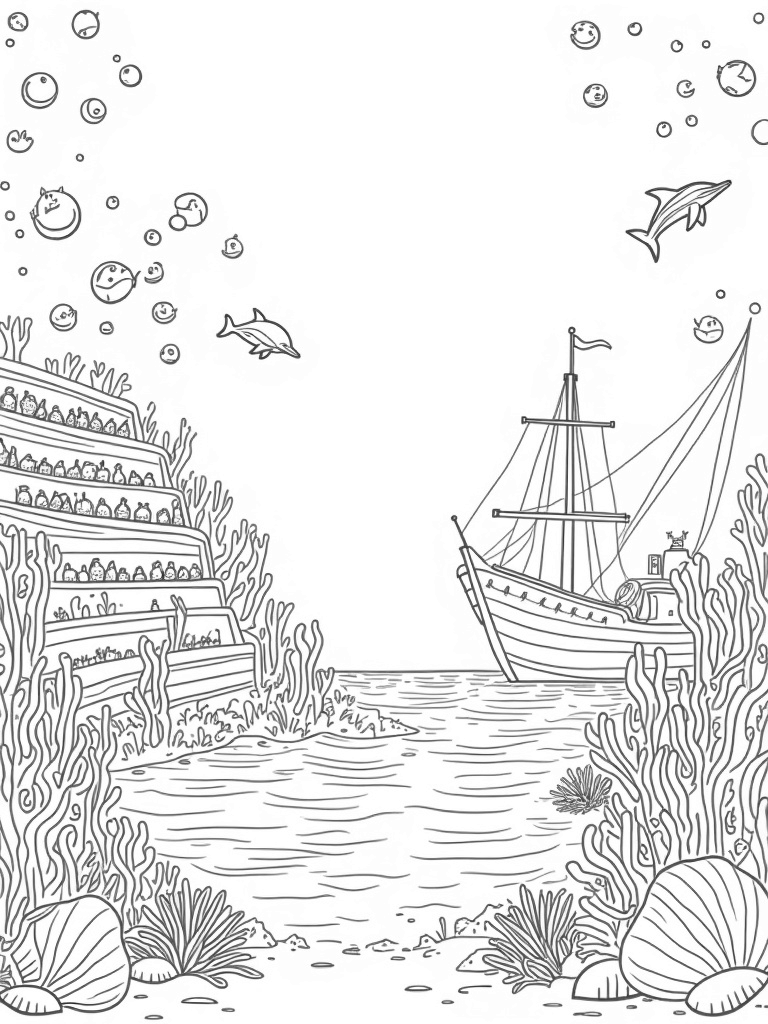 Look up, and you’ll see bubbles rising in spirals, each one holding its own tiny ocean scene. What do you think is inside? Maybe a little crab having a party or a turtle taking a nap! And in the background, there's a sunken ship covered in vibrant anemones, with curious starfish peeking out, all eyes on the dolphins.