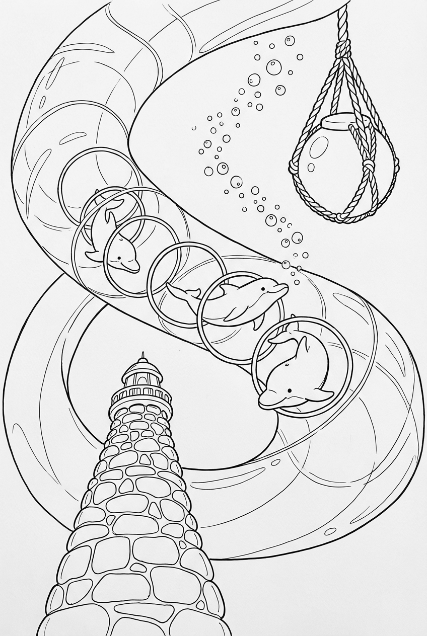 You’ve got three playful dolphins swooping through a set of gleaming steel rings that twist around a spiraling water tunnel. Below them, a tall sea‑glass lighthouse rises like a glittering stalk, its lantern shaped like a giant pearl hanging from tangled kelp ropes. Little bubbles drift upward, scattering like tiny stars across the scene. All the lines are clean and bold, so kids can add their own splash of color wherever they like.