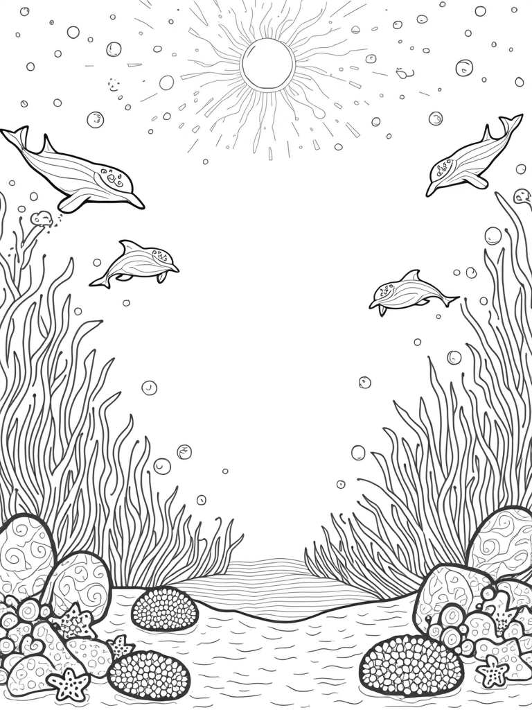 Just above the dolphins, a giant seashell opens wide, revealing shimmering pearls that seem to float like bubbles. The sunlight streams through the water’s surface, casting a beautiful mosaic of light on the sandy ocean floor. And if you look closely, you’ll spot starfish and sea urchins nestled among seaswept treasures, just waiting for young artists to bring them to life with color.