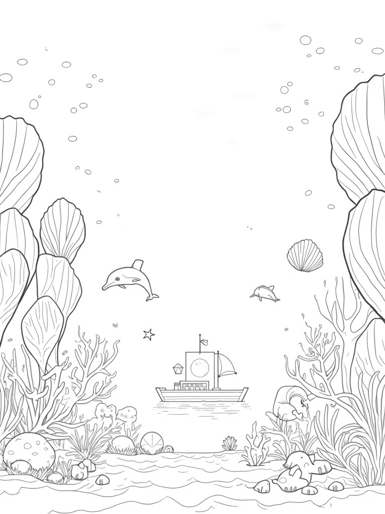 Imagine a vibrant underwater garden where dolphins are leaping gracefully through giant, swirling seashells. The coral structures rise tall like colorful skyscrapers, each covered in intricate patterns that invite your imagination. Above, the shimmering ocean surface creates beautiful dappled light that plays on the ocean floor, making everything feel magical.