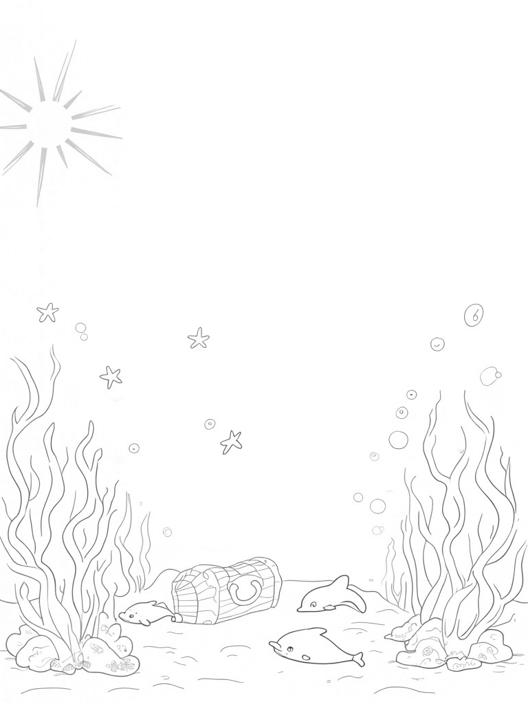 As you color, don’t forget to check out the shimmering treasure chest resting on the sandy seabed. It’s adorned with beautiful seashells and glows softly, adding a magical touch to the whole picture. Bubbles rise to the surface, and each one holds a tiny starfish, waiting to be colored in. The sunlight filtering down creates lovely patterns, making the whole underwater scene feel alive!