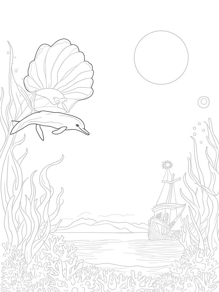 Dive into this free, printable coloring page featuring dolphins! Kids can color a serene underwater landscape filled with vibrant coral, a glowing pearl, and a sunken ship. Perfect for little artists who love the ocean!