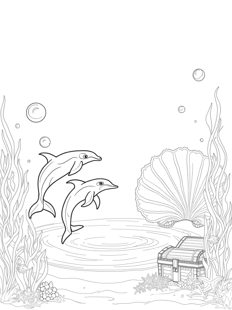 This scene captures a lively underwater world where two dolphins leap through a ring of bubbles, looking like they're having the time of their lives! Nearby, a giant seashell stands tall with beautiful patterns that are just waiting for your favorite colors. You can also spot a bunch of starfish clinging to the shell, making it their cozy home.