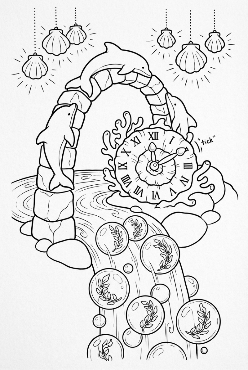 Look up and you’ll spot a huge marble dolphin arching over a bright blue tide. Below it, a waterfall of crystal‑clear bubbles drips down, each one snugly holding a tiny sprig of kelp. Floating nearby are a handful of seashell lanterns that seem to glow on their own, adding a gentle sparkle to the scene. Right in the middle, a spiraled coral clock ticks away with pearl‑shaped hands, giving the whole picture a fun, whimsical vibe.
