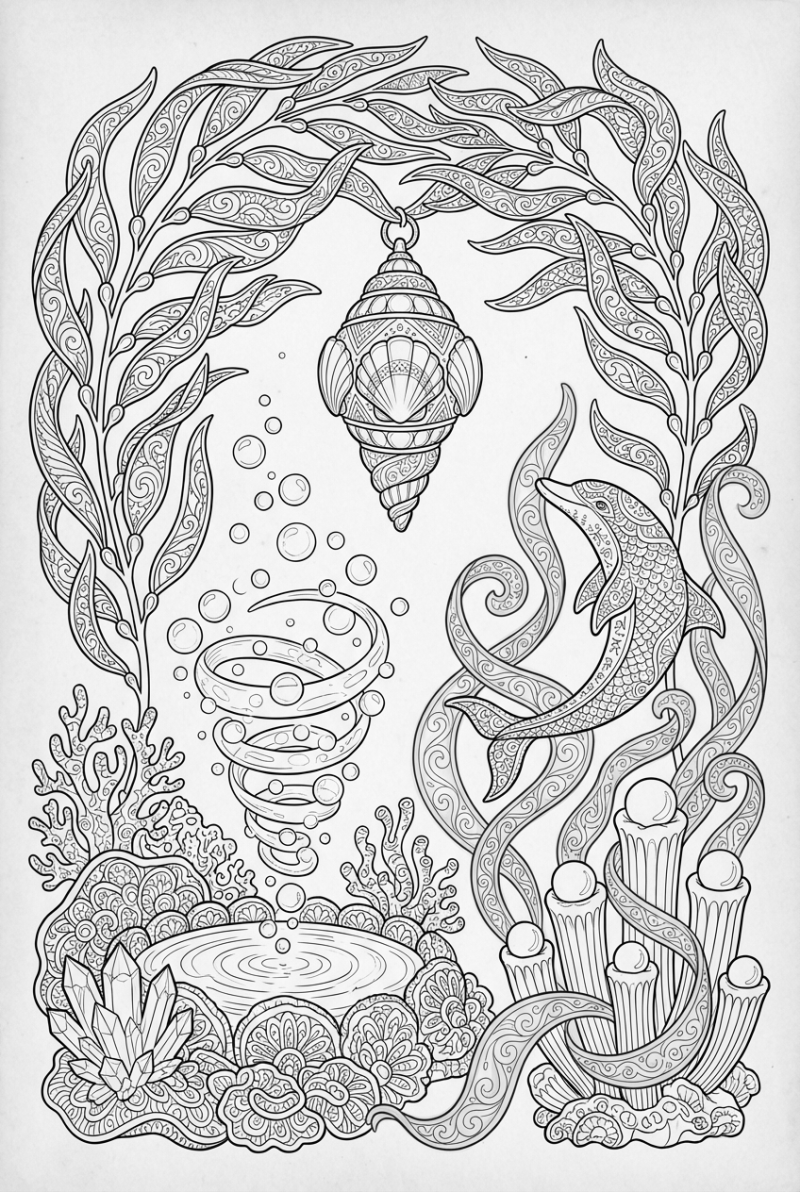 Look at the scene – a graceful dolphin shaped like a moon floats amid a garden of kelp arches. The arches cradle a lantern made of polished shells, casting a soft glow over a crystal tide pool. From the pool a swirl of translucent bubbles rises in a tiny vortex, and ribbons of luminous seaweed wind around the dolphin like gentle streamers. Nearby, pearl‑capped coral pillars stand tall, holding a floating strip of neon seafoam that seems to pulse with color. Every line is clean and ready for a little hand‑to‑paper magic.