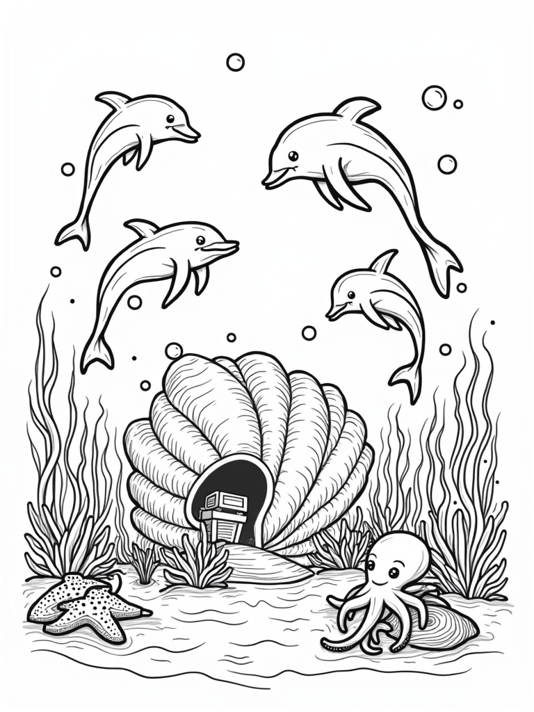 Check out this free, printable coloring page featuring playful dolphins, a cozy seashell home, and a friendly octopus! Perfect for kids who love ocean life and want to add their own splash of color.