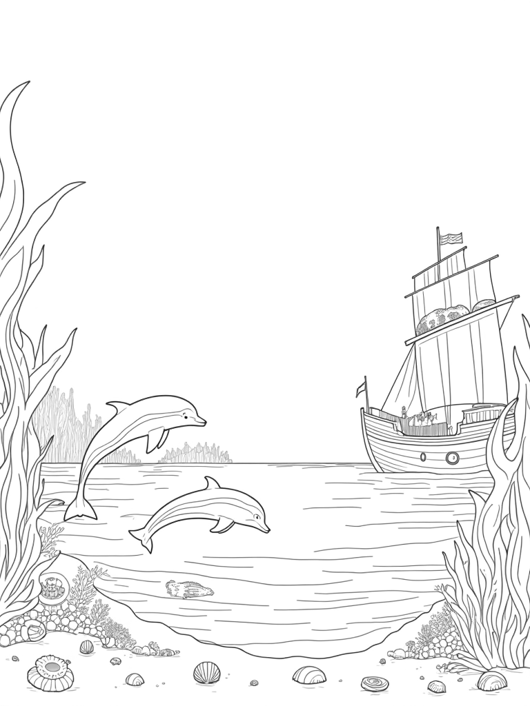 In the background, there’s a giant, ornate sunken ship that acts like a cozy home for all sorts of vibrant marine life. The ship’s portholes frame curious little fish swimming by, making this scene even more magical. Kids can have a blast coloring in all the details, from the dolphins to the intricate coral patterns and the mysterious ship. It’s a perfect way to spark creativity and learn about the wonders of the ocean!