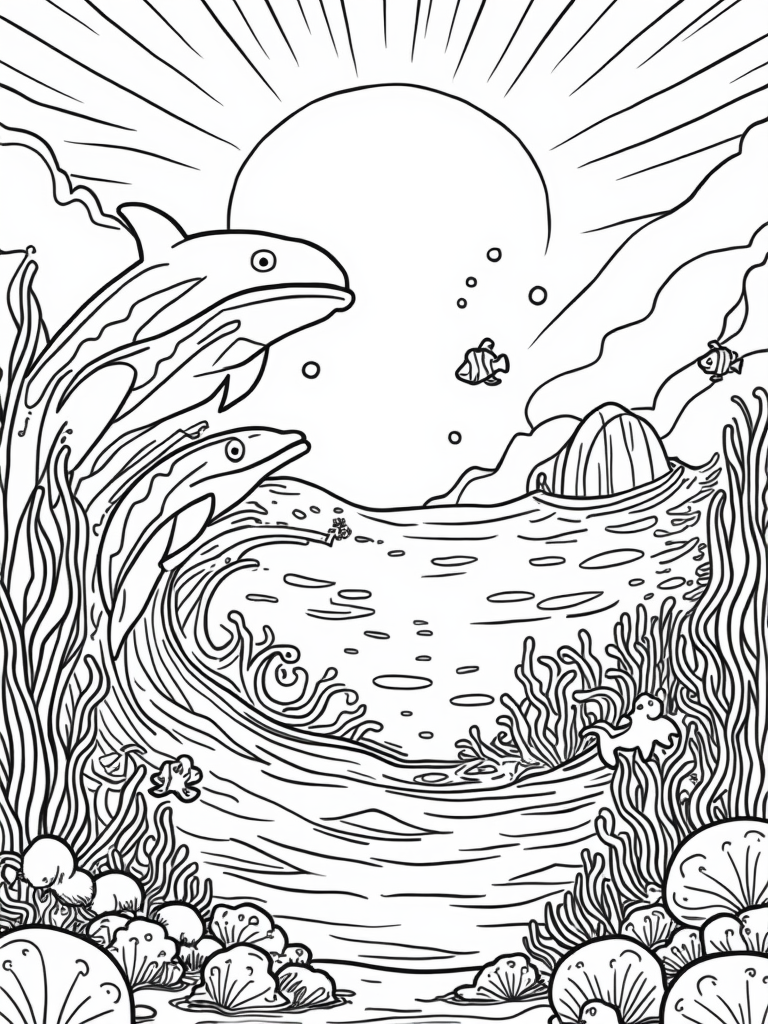 Check out this free, printable coloring page featuring playful dolphins and a vibrant underwater landscape! Perfect for kids who love ocean life, it's a fun way to get creative with colors.