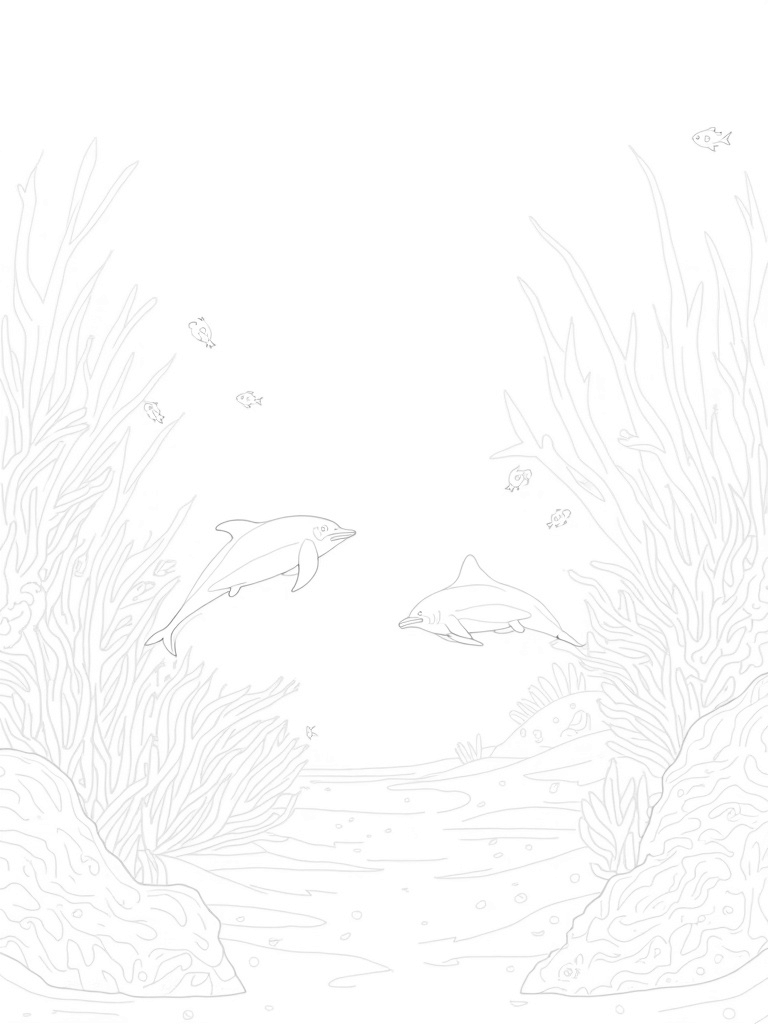 Playful Dolphins in a Tranquil Underwater Landscape Coloring Page