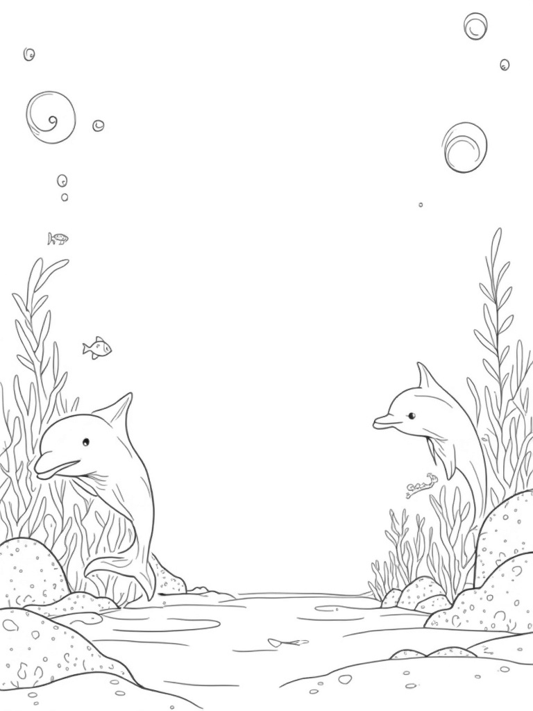 Check out this free, printable coloring page featuring playful dolphins in a serene underwater grotto. Perfect for kids who love marine life, this coloring page is ready for some vibrant colors!