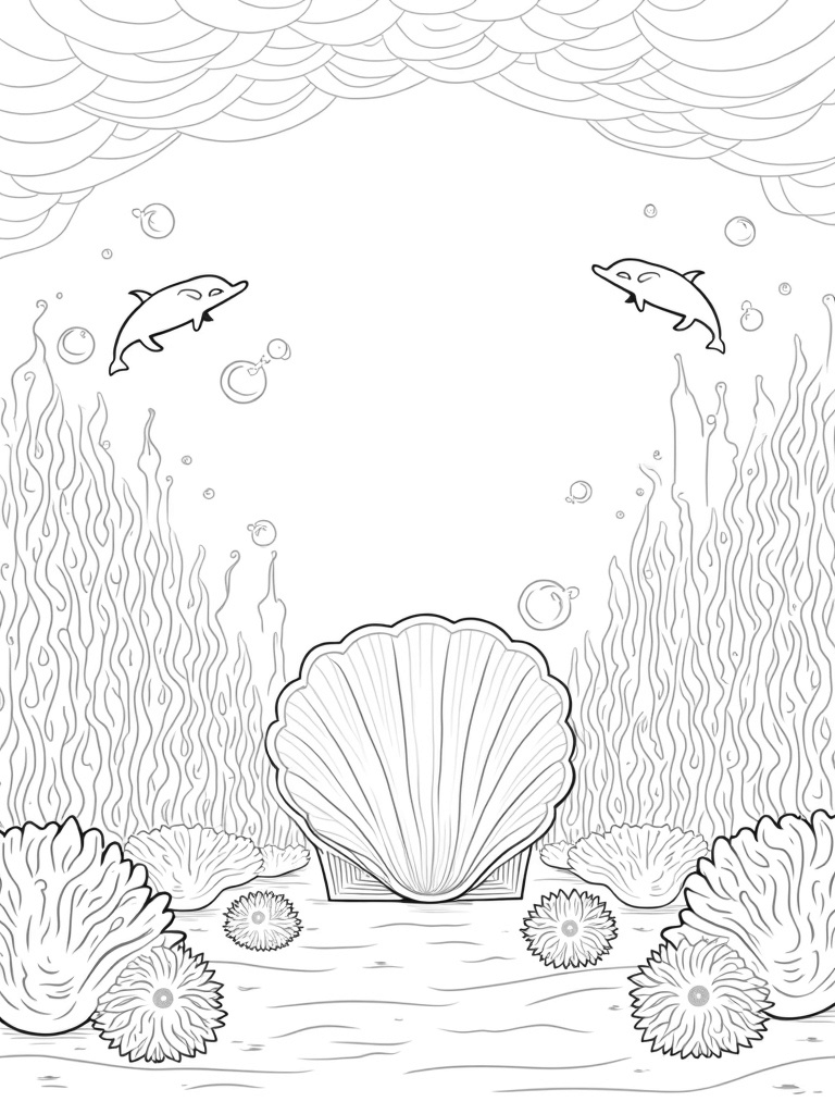 Imagine a bustling underwater city made entirely of coral and shells! Towering spires look just like dolphins leaping joyfully through the waves, while colorful seaweed sways gently, creating beautiful curtains around a stunning seashell at the center. Bubbles float up, and if you look closely, you’ll see tiny playful dolphins peeking out from inside them. Schools of fish dart through archways formed by giant anemones, adding splashes of color to the scene.