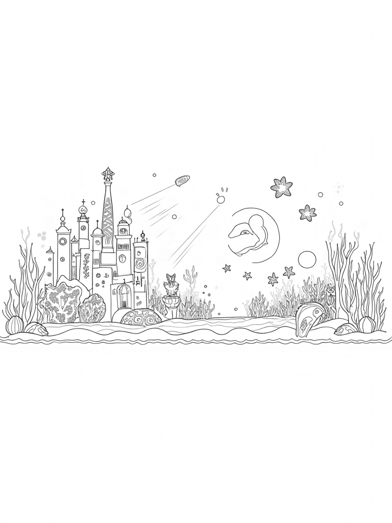 This page is all about a magical underwater city! Picture tall coral towers shaped like your favorite musical instruments, creating a colorful skyline beneath the waves. You'll see dolphins leaping and twisting through the water, playing with a school of vibrant fish that swirl around them in a beautiful dance.