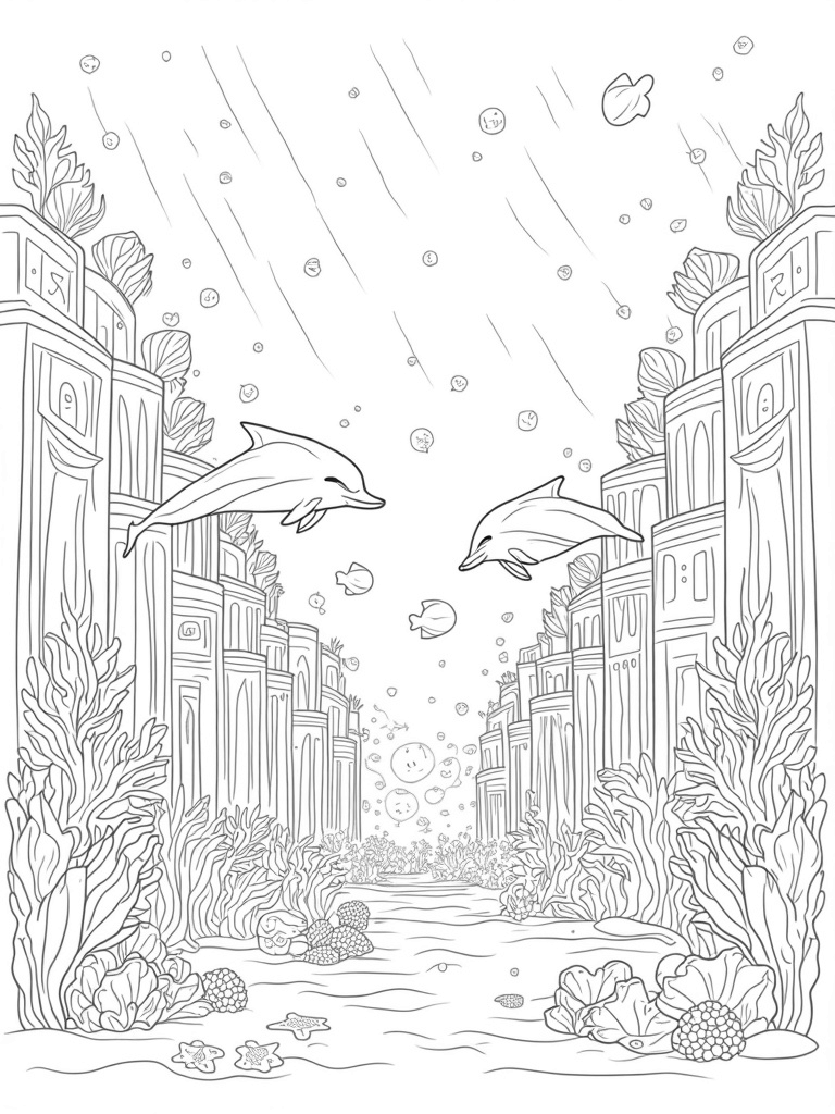 Underwater City with Dolphins and Coral Skyscrapers Coloring Page