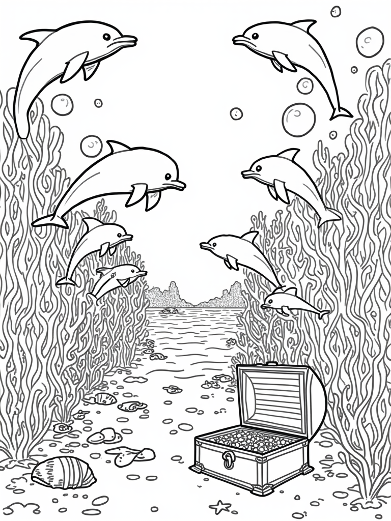 In the background, seaweed trees sway gently, their fronds resembling hair caught in a soft breeze. Hidden in the coral, you can spot shining pearls that glimmer like little treasures. And don’t forget the cheerful treasure chest spilling out coins, which has definitely caught the attention of those curious dolphins! It's a lively scene that’s sure to spark the imagination.
