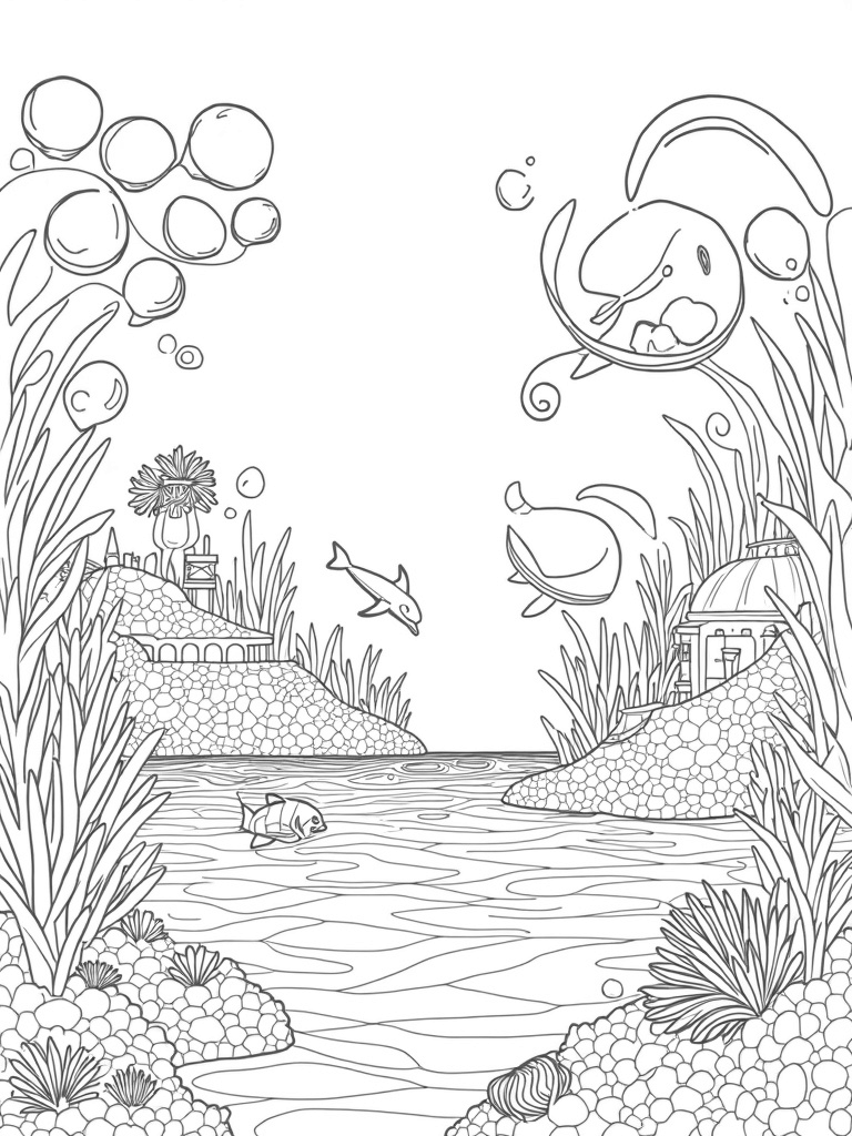 This colorful scene is all about an amazing underwater city made from coral and seashells. You'll see dolphins leaping through seaweed archways, which is super fun! Plus, giant bubbles are floating up, each one filled with unique designs of friendly fish and vibrant marine plants, just waiting for your favorite colors.