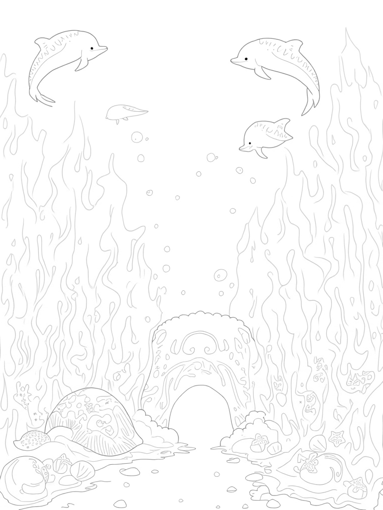 Underwater Coral City with Dolphins and Turtles Coloring Page