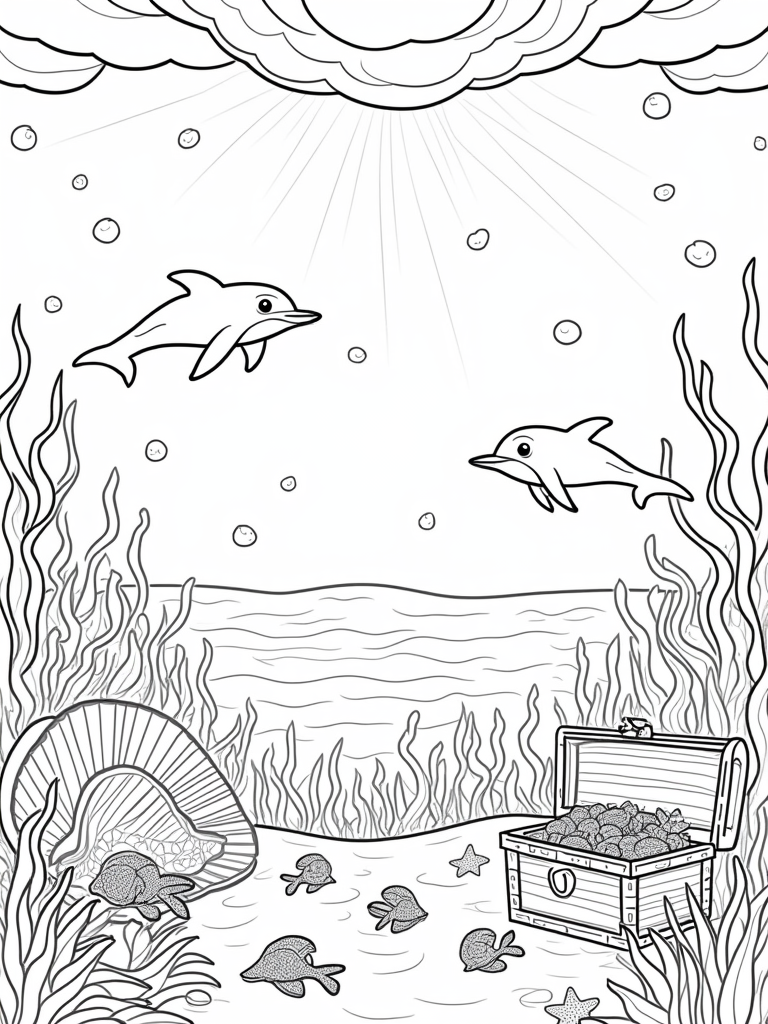 Underwater Dolphins and Colorful Coral Scene Coloring Page
