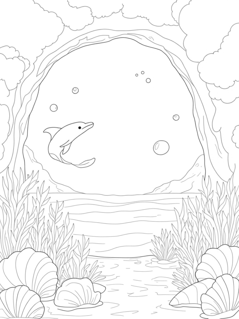 This scene captures a beautiful underwater garden where dolphins leap gracefully through a forest of swaying kelp. The giant seashells and vibrant coral formations create a lively backdrop, perfect for some colorful creativity. Look closely at the bubbles rising from the ocean floor, forming a magical canopy of floating orbs above!